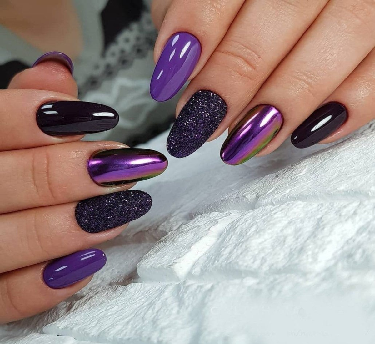 - Розмаїття відтінків. Популярні кольори дзеркального манікюру – золото чи срібло, але можна вибрати інші тони: від холодних металевих до насичених яскравих.